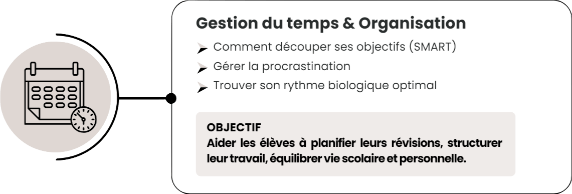 Les ateliers sur la motivation, l’organisation, la gestion du temps ou la concentration permettent aux collaborateurs de renforcer leur autonomie et leur performance. Ils repartent avec des stratégies concrètes pour être plus focalisés, mieux structurés et plus productifs.