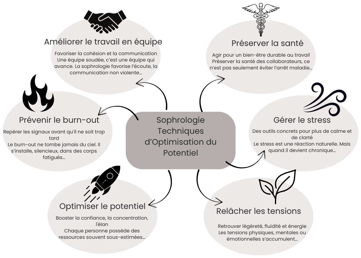 Sophrologie, gestion du stress, techniques d’optimisation du potentiel, ateliers de cohésion, prévention du burn-out : autant d’outils au service du bien-être, de la motivation et de la qualité de vie au travail.