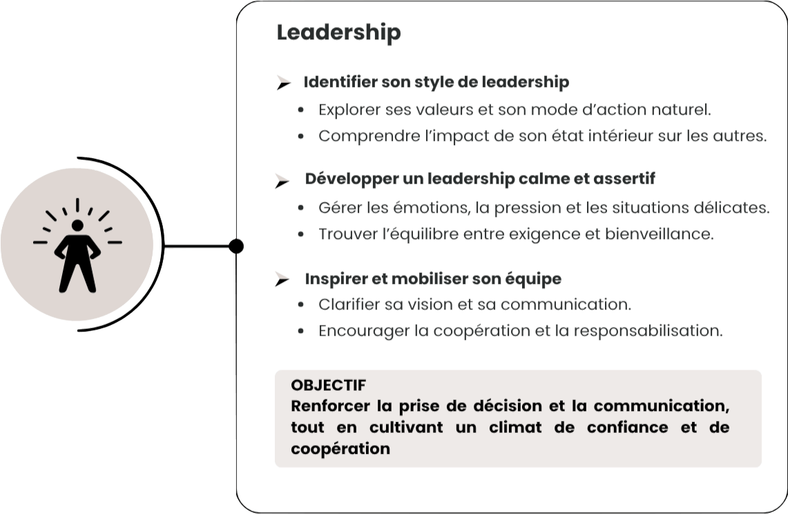 Grâce à un travail approfondi, les participants développent un leadership basé sur la clarté, l’écoute, la posture et la confiance. Ils apprennent à fédérer sans pression, à communiquer de manière plus fluide et à incarner un rôle mobilisateur et apaisant.