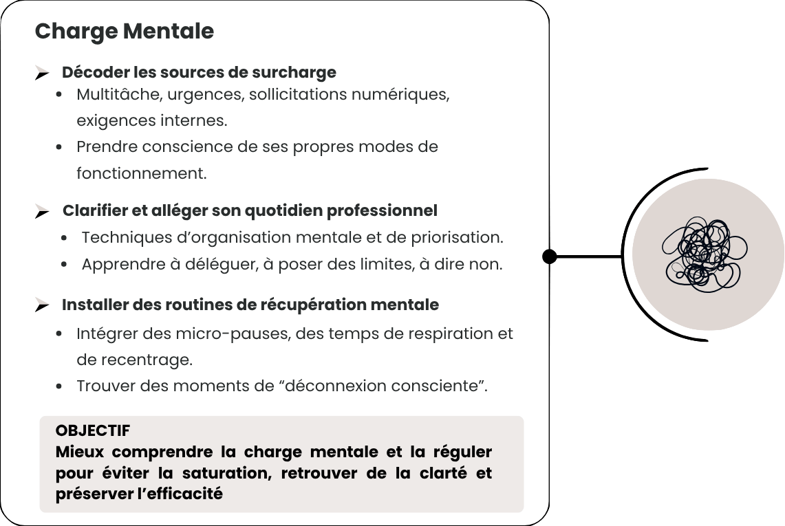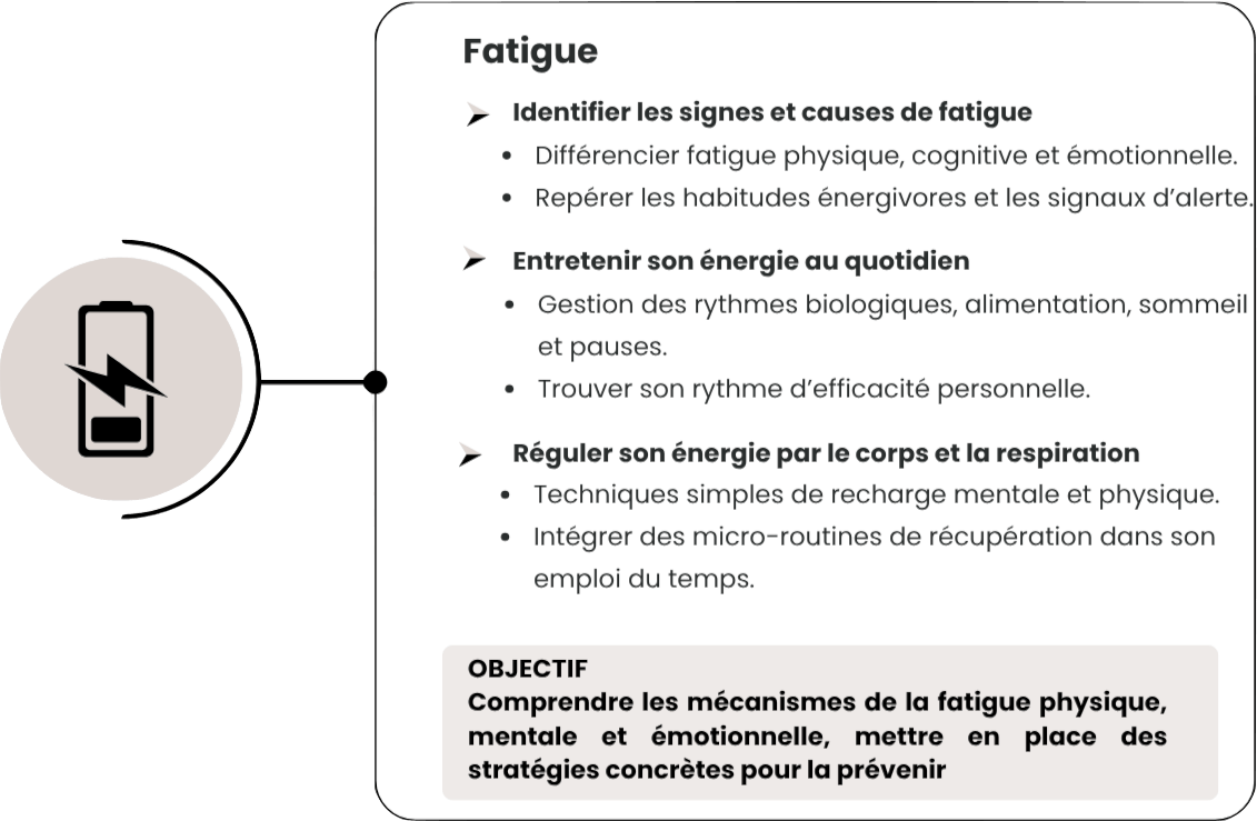 Le module permet d’identifier clairement les sources d’épuisement, les signaux d’alerte du burn-out, et d’intégrer des stratégies concrètes pour préserver son énergie. Les collaborateurs repartent avec des habitudes simples pour mieux gérer leur charge cognitive et émotionnelle.